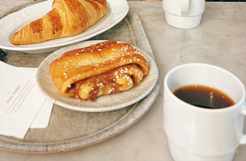 - カウンターに並ぶ美味しそうなパンやケーキ:大きなシナモンロールやケーキなど美味しそうなものがカウンター前に並んでいます。英語が苦手でも指差しで頼むことができるのでありがたい。