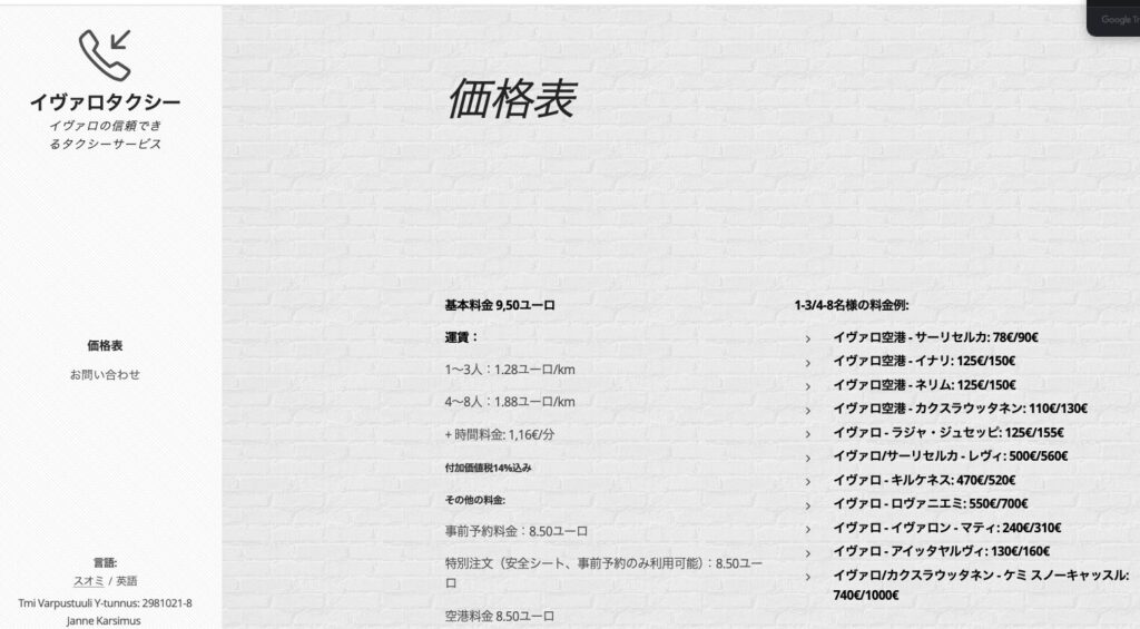 予約ページ「https://www.ivalotaxi.fi/pricelist/」